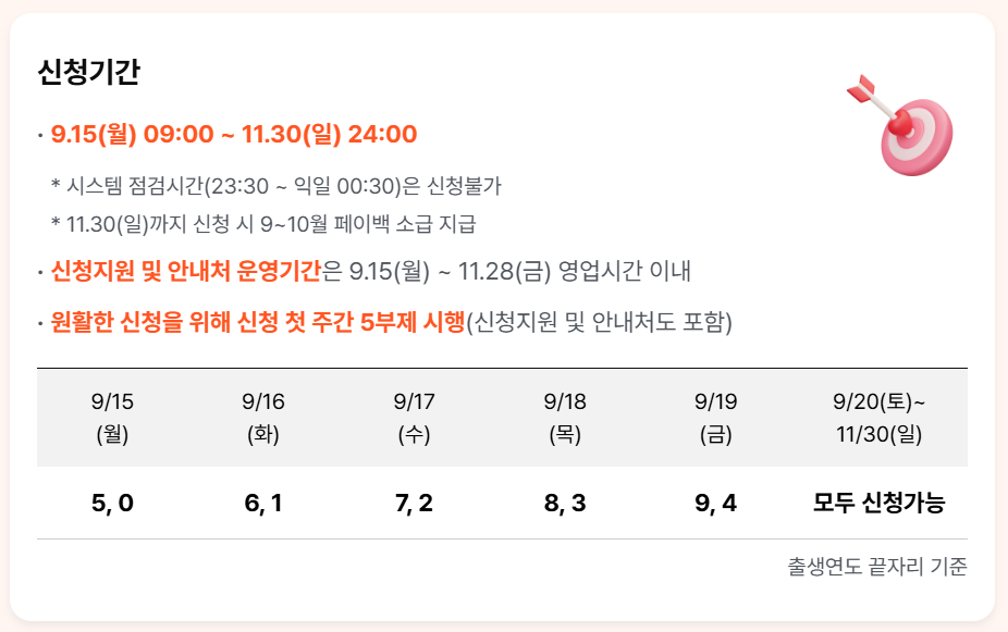 신청 첫 주에는 출생 연도 끝자리 기준으로 요일제가 적용되며, 이후에는 언제든지 신청이 가능합니다.