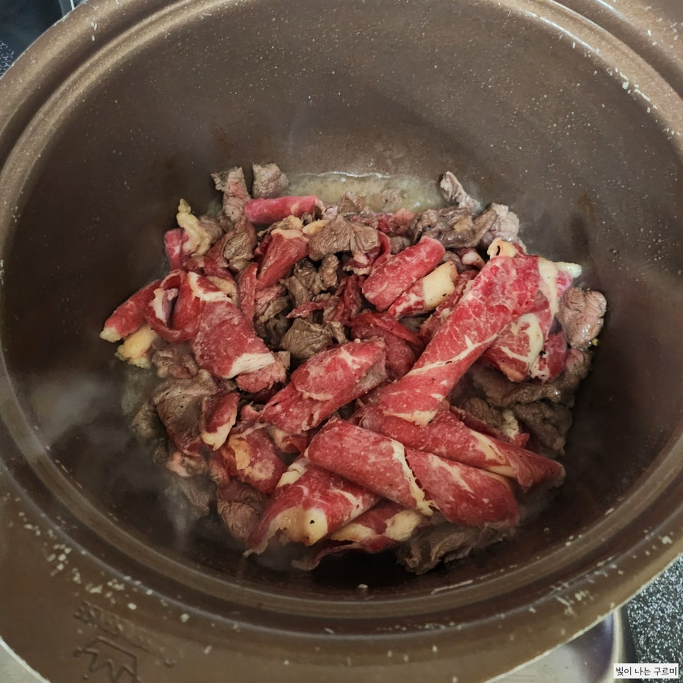 2.반쯤 익은 소고기에 잡내를 잡기 위해 맛술 1스푼 넣어주기