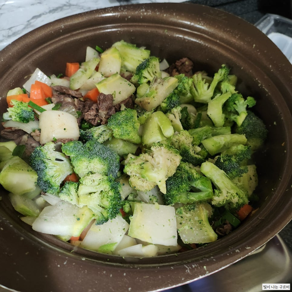 3.소고기가 익으면 야채를 가장 늦게 익는 순서대로 넣어서 함께 익혀주기